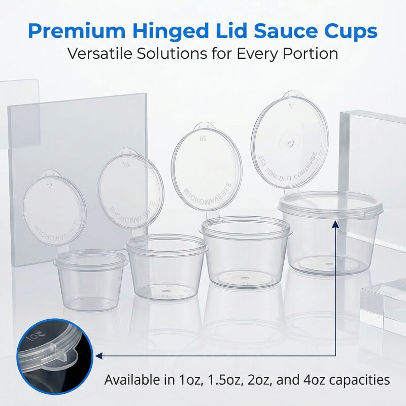 Many disposable sauce cups on the market are flimsy, leak-prone, lack secure lids, or come in limited sizes—failing to meet the diverse needs of takeaway businesses and end consumers. Our Disposable Plastic Sauce Cups With Hinge Lid solve these pain points, with core advantages centered on their durable plastic material, convenient hinge lid, assorted 1oz to 5oz sizes, portion control design, and disposable functionality—delivering unique value for both B2B buyers and end consumers.