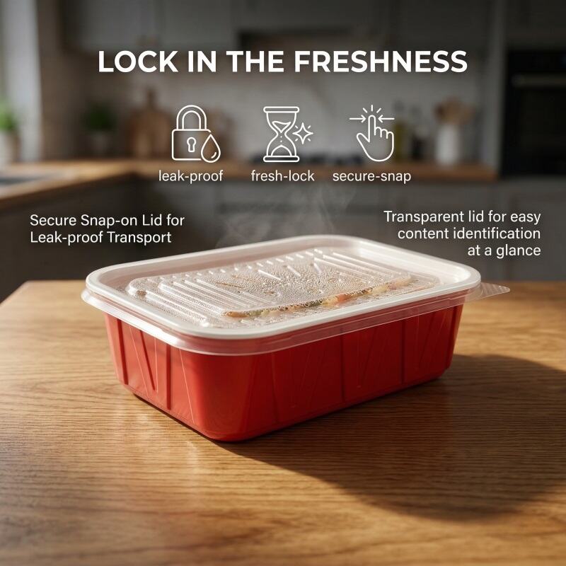 Our red & white microwave safe lunch boxes are designed specifically for takeaway needs. They are available in multiple sizes (single-serve, family-style) and compartment options (1-4 compartments), making them suitable for simple lunch bowls, elaborate bento sets, sandwiches, salads, and more. The compact, stackable design saves storage space in your kitchen and maximizes delivery efficiency by fitting easily into takeaway bags. The secure fitting lid creates an airtight seal, preventing leaks and seepage of sauces or soups during delivery—reducing customer complaints and protecting your brand reputation. The lid is also microwave-safe, ensuring full convenience for end consumers.