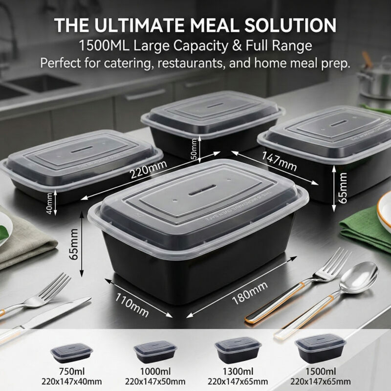 Our Microwavable Black Rectangle Meal Prep Food Containers are versatile enough to accommodate a wide range of meal scenarios, making them a perfect fit for various businesses. They are ideal for meal prep services packing balanced, portion-controlled meals, takeaway restaurants serving rice bowls, stir-fries, or bento-style meals, and even catering services offering boxed lunches. The rectangle shape with round compartments is suitable for both hot and cold meals, while the microwavable design adds convenience for end consumers. The containers are available in multiple sizes, allowing you to choose the perfect fit for single-serve meals, family portions, or side dishes—ensuring flexibility for your menu and meal prep needs.